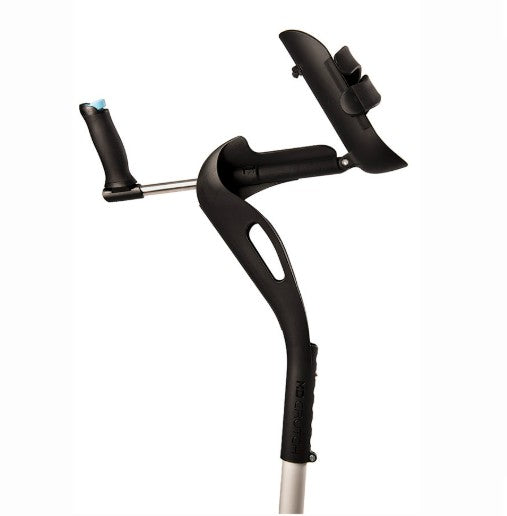 • A hinged arm cradle that can be unlocked to provide an enhanced range of motion-enabling the user to reach for things without having to remove the crutch.
